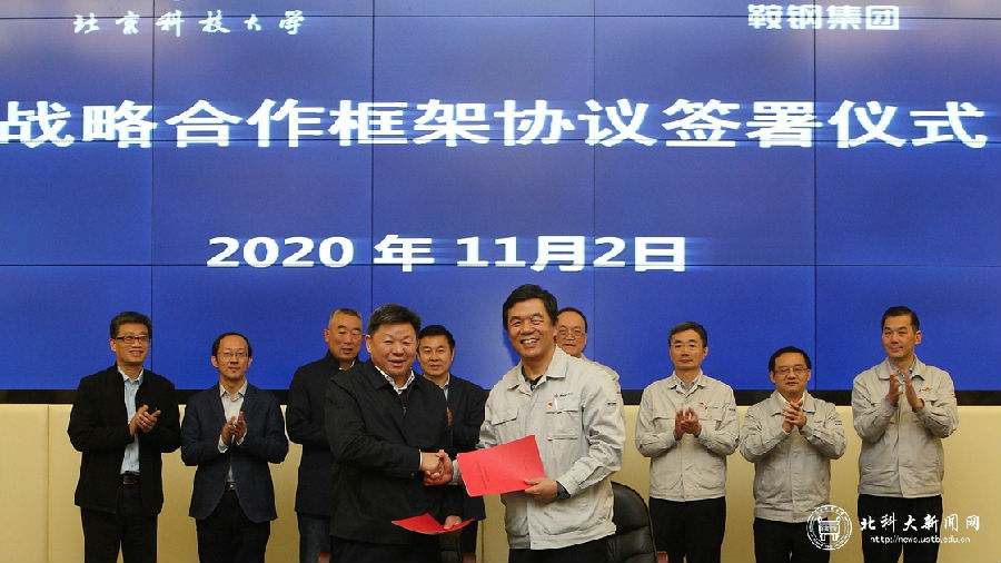 11月2日,北京科技大学与鞍钢集团有限公司(以下简称“鞍钢集团”)战略合作协议签约仪式暨学术交流活动在鞍钢集团会展中心举行。鞍钢集团董事长谭成旭,总经理戴志浩,副总经理邵安林、段向东;我校校长杨仁树,中国工程院院士毛新平,副校长吴爱祥出席签约仪式。戴志浩、杨仁树代表双方在战略合作协议上签字。签约仪式后,谭成旭与杨仁树一行举行会谈。