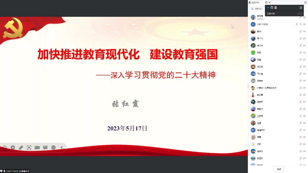 张红霞以《加快推进教育现代化 建设教育强国——深入学习贯彻党的二十大精神》为主题,从四个方面对我国教育事业的发展、新时代党和国家对教育事业的总体布局和奋斗目标等重点进行了详尽、系统的解读。一是我国教育现代化的发展历程;二是我国教育现代化的重要成就;三是我国推进教育现代化面临的困境;四是我国推进教育现代化的突破点。